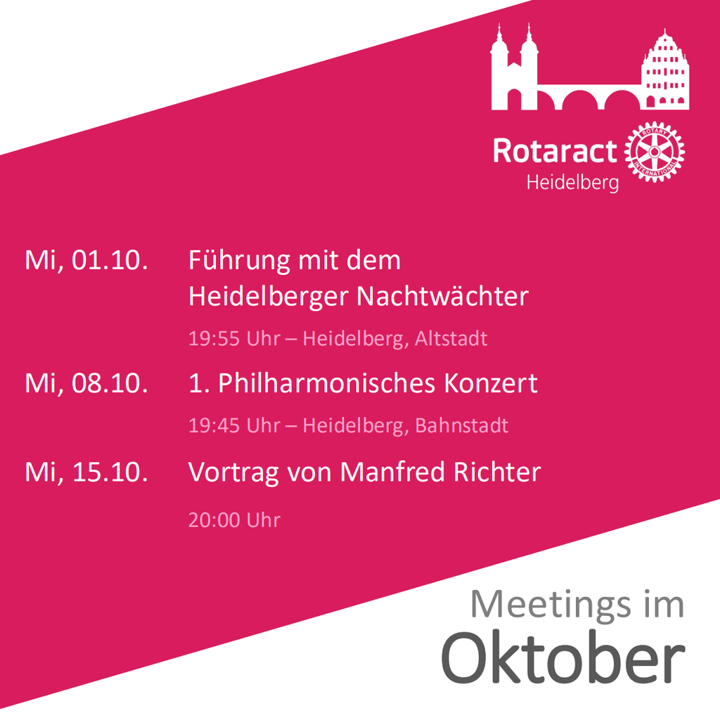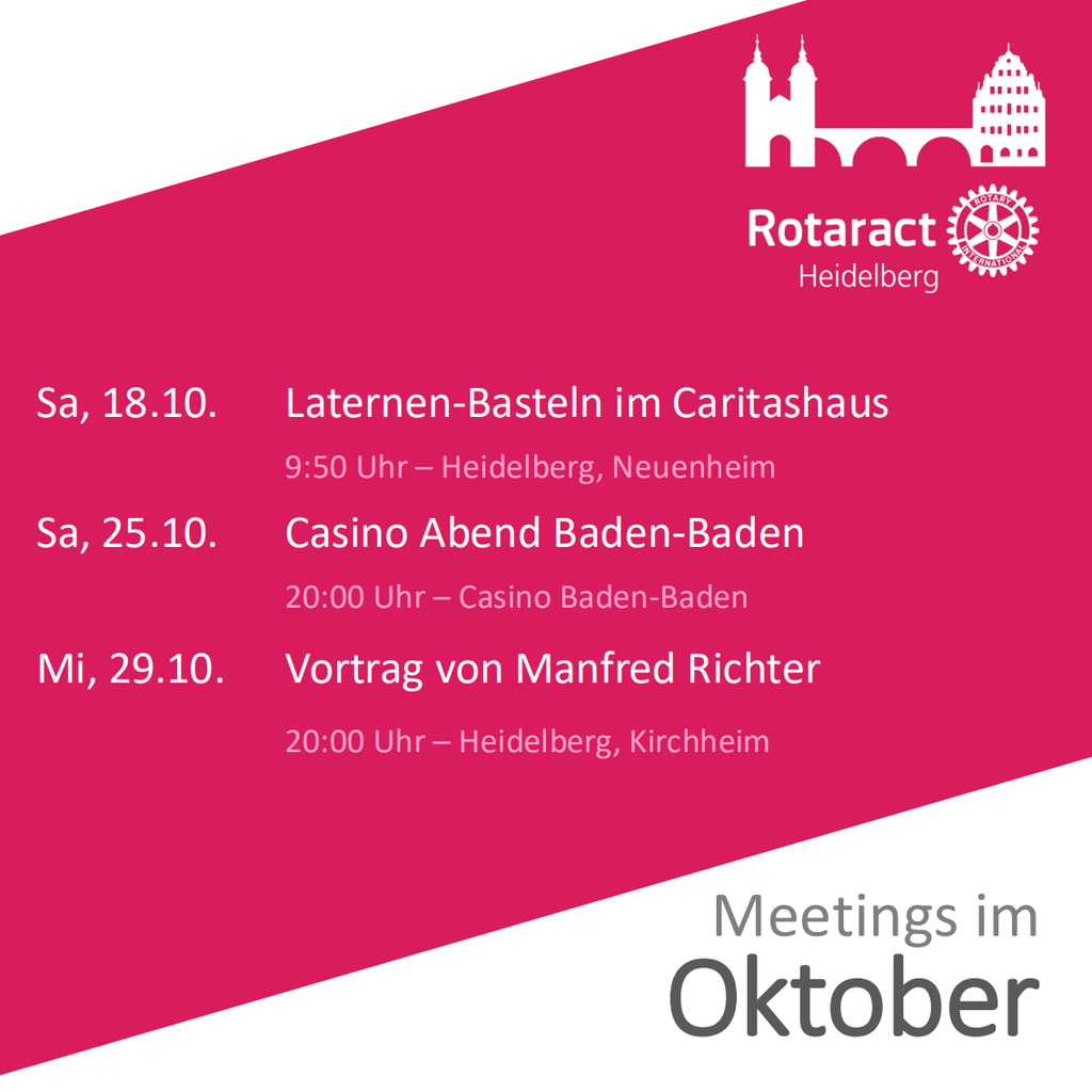 Wir treffen uns in der Regel jeden Mittwoch Abend. Auf der Agenda steht beispielsweise die Planung für eine anstehende Sozialaktion, ein Vortrag, oder auch gemeinsamer Abend. Werfe einen Blick auf den bevorstehenden Monat und kontaktiere uns um Teil eines unserer Meetings zu werden! Wir freuen uns auf deinen Besuch!